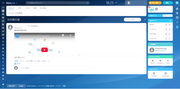 ログイン後、Bitrix24のダッシュボードが表示されます。ここから、タスク管理、CRM、チャットなどの各種機能にアクセスし、すぐに業務を開始。